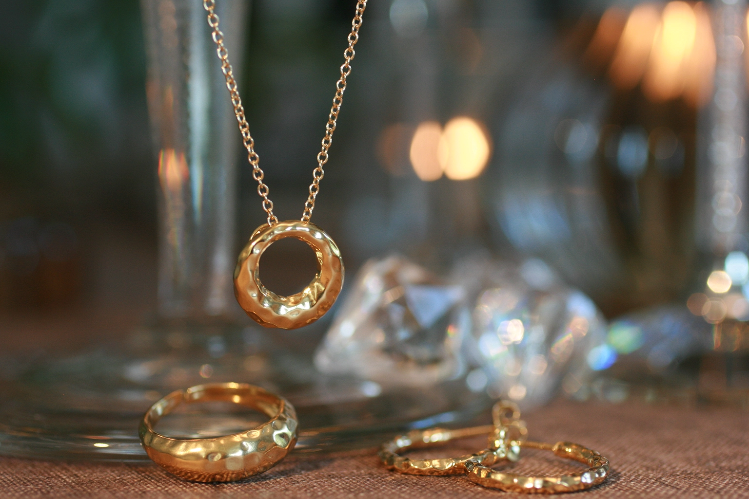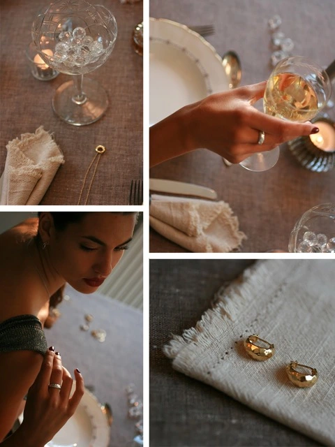 Den noggrant hamrade ytan skapar ett subtilt spel av skimmer som påminner om festens ljus. Varje smycke är designat för att framhäva en outfit – vare sig det är till en elegant middag, en kväll med vänner eller en oförglömlig nyårsafton.